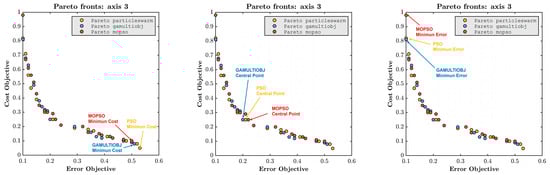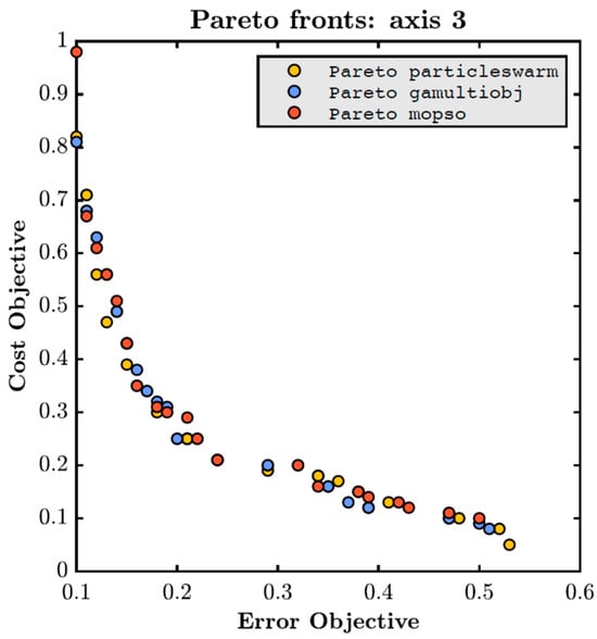 Finally, the set of non-dominated points was obtained based on the 15 Pareto fronts produced by each algorithm, thus deriving a “definitive” Pareto front. From the definitive Pareto front achieved with each algorithm, three characteristic points were calculated: the point of minimum error, the point of minimum cost, and the central point, which is the farthest from all extremes and is defined in [1]. The maneuver was also simulated for the design variable configurations associated with these points, obtaining the error signal and control actuation for each case. In Figure 4, a comparative graph between the different Pareto fronts provided by each algorithm for the yaw axis can be observed. As can be seen, the achieved results are generally similar. Figure 5 shows the three characteristic points: minimum error, minimum cost, and the central one of each optimizer in the Pareto front. Note that PSO and GAMULTIOBJ can find a minimum error design point like MOPSO, consuming 20% less energy. On the other hand, PSO found the lowest cost point but at the expense of having a higher error.