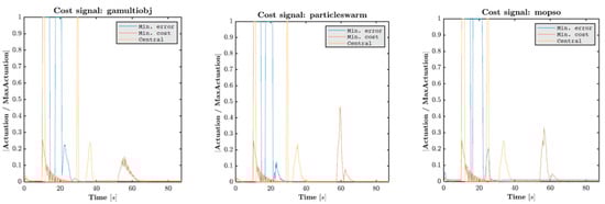Actuation associated with the characteristic points of the Pareto front: central point, minimum cost, and minimum error.