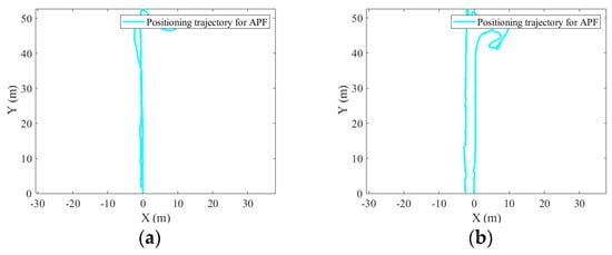 Positioning trajectory for APF in the 2nd experiment: (a) calling gesture; (b) dangling gesture; (c) handheld gesture; (d) pocketed gesture.