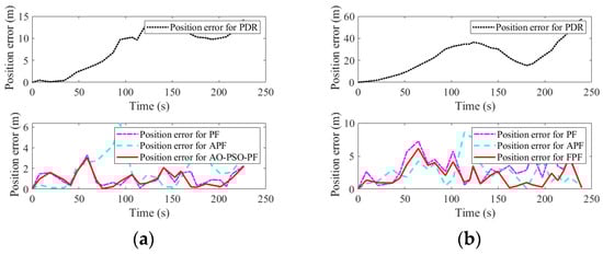 Positioning errors for PDR, PF, APF, and AO-PSO-PF under different smartphone usage gestures in the 2nd experiment: (a) positioning errors in the calling gesture; (b) positioning errors in the dangling gesture; (c) positioning errors in the handheld gesture; (d) positioning errors in the pocketed gesture.