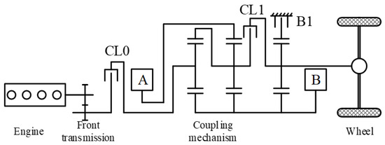 Among them, the engine connects to the coupling mechanism input through the front drive, and the main clutch CL0, engine start and torque output are realized by controlling the master clutch CL0 engagement and separation. Motor A and motor B can adjust the engine operating point by changing the distribution ratio of the electromechanical power flow in the hybrid drive mode so that the engine operates in the high-efficiency zone, fully utilizing the advantages of the high mechanical drive efficiency and continuously driving the electric drive, which is the torque fast response of the motor. In addition, as presented in Table 2, the pure electric mode is driven by Motor B. By operating the clutch CL1 and the brake B1, two kinds of hybrid driving modes are, respectively, realized to satisfy the driving demand of the vehicle in different vehicle speed ranges.
