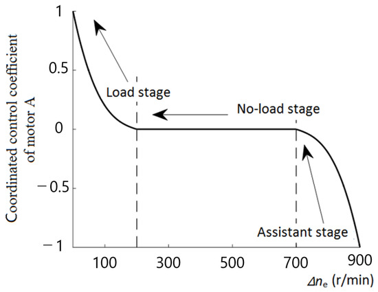 After the engine reaches the firing speed, it generates the output torque and enters the engine’s active speed regulation stage. According to the engine’s unique characteristics, the fuel economy of the engine is roughly 1400 to 1700 r/min. Therefore, setting 1400 r/min is the target speed at this stage. In the EVT1 mode, there is a proportional relationship between motor A and the engine torque. According to the proportional relationship (15), the steady-state target torque of motor A can be calculated. Taking into account the coordinated control of motor A and the engine, this paper introduces a coordinated control coefficient , which is defined as the ratio of the actual torque of motor A in the stage of engine speed regulation to the steady-state target torque, as shown in Equation (16). In the steady-state condition, motor A is the load of the engine and . When the difference between the actual engine speed and the target engine speed is large, let take a negative value, that is, the motor A torque can play a role of assist; when the engine speed comes gradually close to its target speed, gradually approaches 1; that is, the torque of motor A also approaches the steady-state target torque. In the stage of engine speed regulation, the trajectory of the deviation of with engine speed is shown in Figure 3.