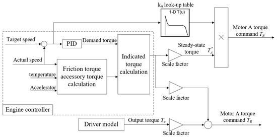 The motor A torque is coordinated by the torque coordination control coefficient, and the motor B torque needs to cooperate with the engine torque to meet the driver’s demand for the output torque. The relationship among the output torque , the engine torque and the motor B torque satisfies Equation (21). The engine torque is obtained from the engine command torque calculation module, and the output torque is obtained from the driver model, as shown in Figure 4. In summary, the coordinated torques of motor A and motor B can be separately calculated. Both are variables related to the engine operating point, which also embodies the characteristics of the stage of engine speed regulation.