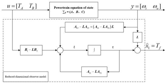 According to Equation (18), the input shaft rotation speed and the output shaft rotation speed (state variable ) can be directly measured by the output variable y, and a state observer must be designed for the road load (state variable ). The state equation for the state variable is