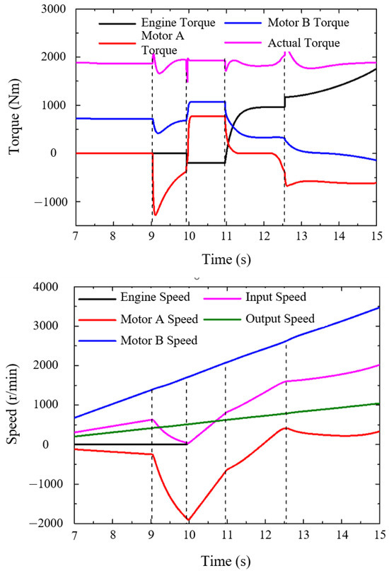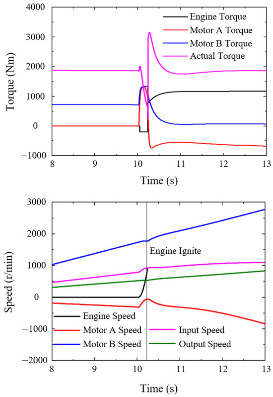 Figure 7 shows the simulation results of the engine starting process when the system does not use coordinated control. Before the engine starts, the vehicle is in pure electric drive mode. At 10 s, the engine receives the start signal; then, the main clutch CL0 starts to adjust speed and engage. It can be seen from the simulation results that the actual output torque drops rapidly in the system, which is due to the intervention of the engine as a load during the start-up process. At 10.4 s, the engine ignites, the actual output torque of the system suddenly increases, and the system also switches to the hybrid drive mode. After that, due to the torque adjustment of motor A and motor B, the actual output torque of the system is gradually restored, and the system is stable to the hybrid drive mode. The entire starting process has a torque fluctuation of 2000 Nm, and the maximum impact of the vehicle reaches 30 m/s3, far exceeding the standard of 10 m/s3.