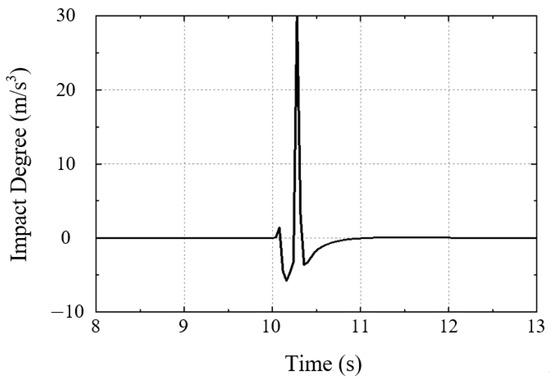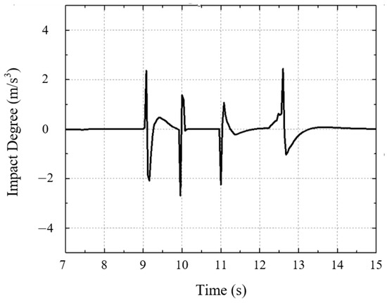 The simulation result after adopting the multi-stage coordinated control strategy is shown in Figure 8. The simulation condition is set as the engine start speed km/h, and the output torque is kept above and below 1900 Nm during the start-up process. As can be seen from the figure, the engine start-up process lasts for 3.5 s from 9.1 s to 12.6 s, and the engine anti-dragging phase takes 1.0 s. The moments of high impact are four key points: clutch start speed, clutch engagement, engine ignition, and engine start-up process. In the multi-stage coordinated control strategy, the maximum impact does not exceed 2.5 m/s3. This advantage is attributed to the strategic conversion of the stability control challenge within the engine start-up phase into a rotational speed tracking control issue, guaranteeing a consistent output torque and diminishing the impact severity.