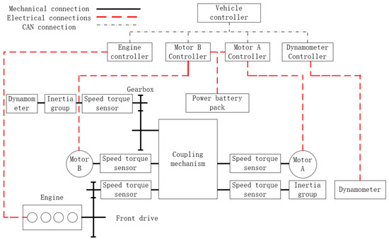 In order to verify the coordinated control strategy of hybrid vehicle engine start, a system test bench was built, as shown in Figure 9. The test bench connection diagram is shown in Figure 10. A full-vehicle controller built with Rapid ECU rapid prototyping was used to calibrate and record test data online using Meca version 1.98 software.