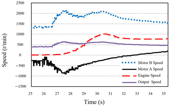 The result of the bench test of the engine starting during the vehicle traveling is shown in Figure 11. First of all, the vehicle works in pure electric drive mode, motor B drive. At 26.4 s, the engine received the start command and entered the engine start mode. Motor A and motor B are driven together and drag the engine speed to idle, so that the engine was ignited. The idle speed regulation mode was reached, and the engine speed stabilized to 800 rpm finally. The entire engine start process lasts for about 5.4 s. During the start-up process, the brake B1 is always engaged. The speed of motor B fluctuates about 600 r/min, and the output shaft speed fluctuates up and down by about 180 r/min. The system speed has little impact.