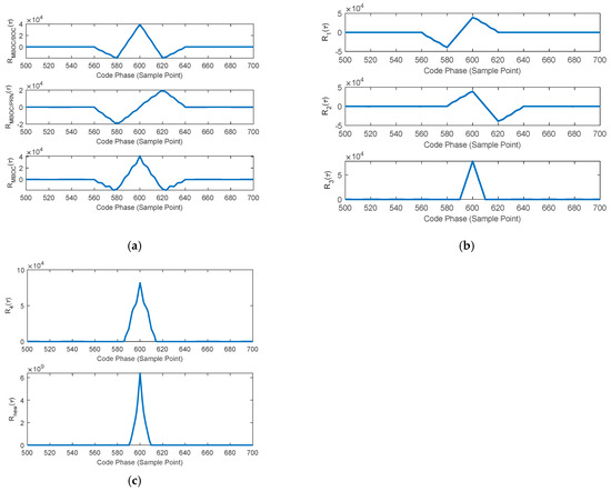 Reconstruction process of MBOC signal by this paper’s algorithm. (a) Correlation functions , , and ; (b) correlation functions , and ; (c) correlation functions and .