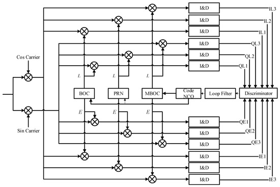 The input signal is mixed with in-phase and orthogonal two carriers, stripped of the carriers, and then correlated with the early and late auxiliary codes generated by the code NCO, and then cleared by integration to obtain (34) [16]