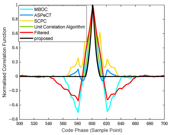 To verify the effectiveness of the de-ambiguous MBOC signal synchronization algorithm based on the reconstructed correlation function, simulation experiments are carried out on this paper’s algorithm, and MBOC signal autocorrelation function, ASPeCT [22], SCPC (Sub Carrier Phase Cancellation) [23], Unit Correlation Algorithm [24], and Filtered Correlation Algorithm [25] are also simulated for comparison. Figure 5 illustrates the results of the simulation experiments, normalized to the six correlation functions for ease of comparison. It is clear from Figure 5 that the correlation function obtained by the ASPeCT algorithm and SCPC algorithm fails to eliminate the side peaks completely, Filtered correlation algorithm obtains a correlation function without positive side peaks but its main peak is wider, and the Unit Correlation algorithm is capable of completely eliminating signal side peaks. Compared to these algorithms, the present algorithm maintains a narrower main peak and eliminates all side peaks.