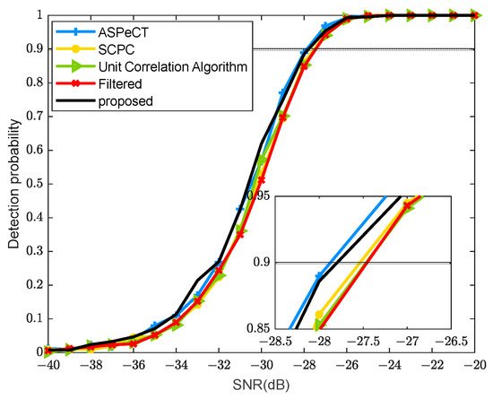 From Figure 6, it can be seen that the detection probability of each algorithm increases as the signal-to-noise ratio increases, and the detection probability of this paper’s algorithm and the ASPeCT algorithm is approximately the same. Assuming that the detection probability is 90%, at −28.5 dB, this paper’s algorithm achieves the corresponding detection performance, which is better than the SCPC algorithm, the unit correlation algorithm, and the Filtered correlation algorithm by about 0.5 dB.