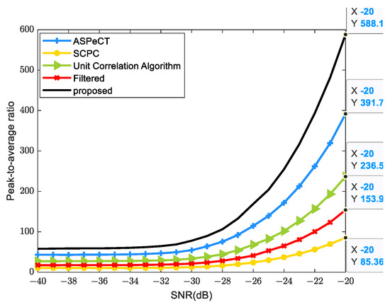 The peak-to-average ratio is a crucial metric in the evaluation of detection performance, serving as an effective indicator for assessing signal acquisition effectiveness by quantifying the amplitude peak relative to the average value of a signal [16,21]. During the acquisition of a signal, if the main peak of the correlation function is too small or the side peak is too high, it will cause the receiver to incorrectly capture the side peak [16]. Therefore, under the same conditions, a greater peak-to-average ratio indicates better algorithm performance [28].