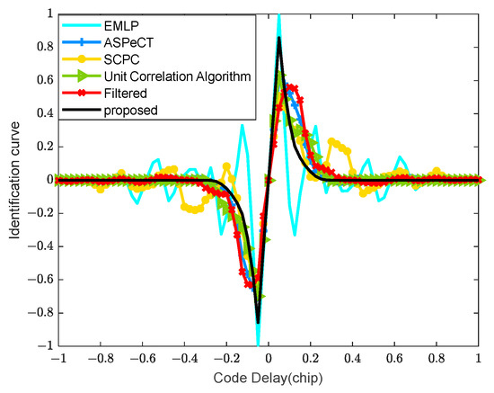 Assuming the presence of one multipath signal influence and setting correlator interval to , Figure 9 shows the comparison of MEE curves using different algorithms. From Figure 9, it can be seen that the envelope extreme value, envelope interval length, and envelope area obtained using this paper’s algorithm are the smallest and, the smaller the three indicators are, the better resistance to multipath interference [11,31], so this paper’s algorithm is effective for anti-multipath interference.