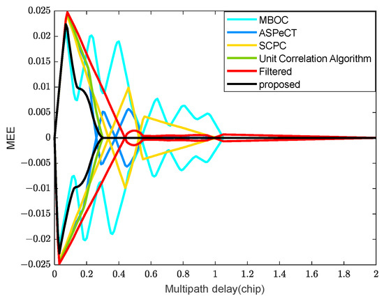 The multipath effect will change the location of the point where the discriminant curve crosses the zero point, resulting in distortion of the correlation function, which in turn triggers the tracking error, so the ability to resist multipath is one of the important indexes to evaluate the performance of the tracking algorithms, among which the Multipath Error Envelope (MEE) is the key index to evaluate the ability of the tracking loop to resist multipath interference [29,30].