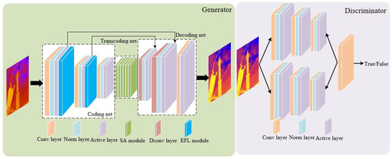 - In the discriminator part, a two-channel discriminator is adopted to capture the difference between the generated infrared image and the target image so as to improve the discriminant network’s ability to discriminate the generated infrared image. Finally, the loss function is optimized to improve the model training convergence speed.