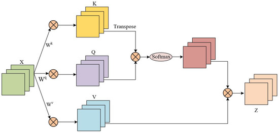 The input X is mapped to query, key, and value. The query represents the query vector, which denotes the location information that the model is currently paying attention to. The introduction of query vector Q can give more attention to the details in the image of infrared substation equipment. The key plays a crucial role in determining the relative importance within the model framework. Specifically, it facilitates the computation of significance in relation to the query vector Q. The interdependence or correlation between the query Q and its corresponding key serves as the fundamental basis for the construction of the attention matrix A. This matrix, in turn, captures the model’s focus or emphasis on different components of the input data, thereby enabling it to prioritize and allocate resources effectively. The output Z of the self-attention mechanism is derived from the dot product between the value V and the attention matrix A. Notably, the self-attention mechanism exhibits a superior capacity in capturing the intricate internal correlations among features. As a result, it possesses a more robust ability to extract the characteristic information of contrast and saturation from infrared substation equipment images. This enhanced capability ensures that the model can capture essential information from a complex image. Finally, the feature mapping capability of the transcoding network is improved to achieve the purpose of enhancing the contrast and saturation of infrared images. The mathematical principle of self-attention can be expressed as