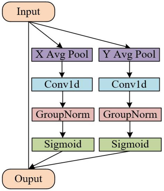 The low-quality infrared substation image has the characteristics of low contrast, colorfulness, and saturation, so it is necessary to first extract the characteristic information from the infrared images through the encoding network when using CycleGAN for image style transformation. However, during the undersampling process, the receptive field of the convolutional operation is too large, resulting in an inability to fully extract the texture information and complex background information of the infrared substation equipment images. Therefore, this paper introduces the efficient localization attention (ELA) mechanism [28], the principle of which is shown in Figure 5. X Avg Pool and Y Avg Pool represent one-dimensional horizontal global pooling and one-dimensional vertical global pooling, respectively, whose mathematical expressions are shown in Equations (3) and (4). and execute average pooling across each channel within two distinct spatial domains to derive horizontal and vertical feature vectors from infrared substation images. This methodology is employed to capture long-range dependencies effectively. The pooled results are subsequently processed through a one-dimensional convolution F and group normalization , followed by activation via the sigmoid function . The underlying principles are illustrated in Equations (5) and (6). The output of the ELA module is denoted as Y as depicted in Equation (7). Compared to the traditional local attention mechanism, the ELA mechanism adopts a sparse matrix operation, which greatly reduces the computation cost and has faster training. Moreover, the ELA mechanism can calculate the attention weight in a local scope so as to maintain local consistency and coherence when enhancing the details of the image. In this paper, by incorporating the ELA mechanism into the coding network of the generator, the network’s ability to capture local features is enhanced, thereby improving the clarity of details in the generated images: