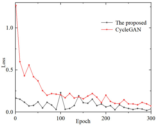 The initial loss function of CycleGAN is divided into two parts: one is adversarial loss function and the other is cyclic consistent loss. CycleGAN has two discriminators, so there will be two adversarial loss functions as shown in Equation (8), where G and F are two generators, respectively, and and represent two discriminators. The other part is cyclic consistent loss as shown in Equation (10). The total loss is equal to the sum of the two: