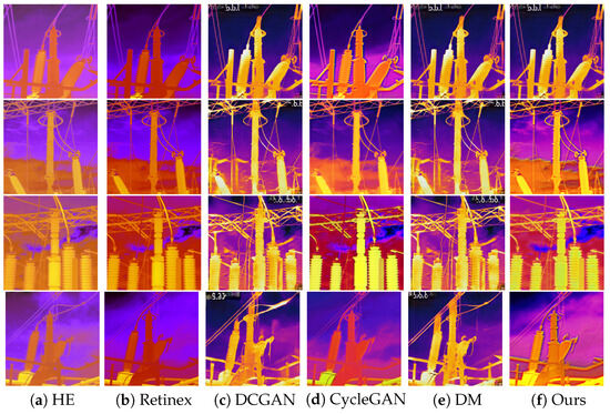 To evaluate the performance of the proposed algorithm objectively and accurately, this paper includes comparisons with several traditional image enhancement methods, such as histogram equalization, the Retinex algorithm, and guided filtering. Additionally, some of the latest deep learning image enhancement methods, including DCGAN and the diffusion model (DM), are selected for comparison. Table 1 presents the results of the relevant evaluation indicators for these different algorithms. The enhancement effects of the Retinex algorithm and the guided filter algorithm are highly dependent on specific parameter settings. Consequently, their performance is suboptimal when processing images of infrared substation equipment. It can be seen from Table 1 that the maximum value of image entropy is obtained by the DM method, which indicates that the DM method has advantages in the richness of the generated image content, but the image quality is poor. Compared with mainstream image enhancement algorithms, the proposed algorithm has obvious advantages, achieving optimal results in terms of image color, saturation, and feature similarity, with average improvements of 10.91%, 18.89%, and 29.82%, respectively. At the same time, due to the introduction the of self-attention mechanism and efficient local attention mechanism with fewer parameters, the model parameter number of the proposed algorithm is reduced by 37.89% compared with the original algorithm. It shows that the proposed algorithm has obvious advantages in processing images of infrared substation equipment.
