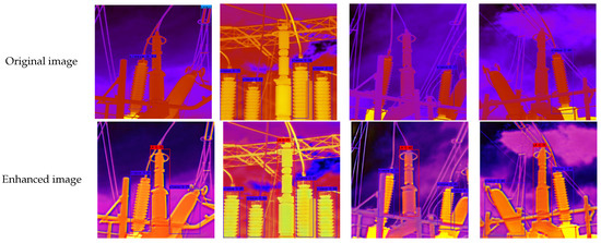 Substation equipment is a critical apparatus for power system [1,2,3]. Owing to the continuous operation of substation equipment in various harsh weather and heavy load for a long time, it is easy to break down, which has a great impact on the reliable operation of the power system [4]. Substation equipment failures are often accompanied by local overheating, it is important to recognize this situation in time [5,6]. With the rapid development of infrared thermal imaging technology, drones, robots and cameras equipped with infrared thermal imagers have been widely used in the daily inspection of substation equipment [7,8]. It is inefficient to analyze the infrared images of massive substation equipment manually, and the realization of automatic infrared image fault detection of substation equipment is an important part of the construction of smart power grid. However, in the process of collecting infrared images, due to factors such as camera shake, insufficient exposure time, unsuitable shooting angle and environmental interference, the image shows poor contrast, blurred details and missing texture information [9], just as shown in Figure 1. The low-quality infrared images of substation equipment will have great influence on the subsequent fault detection. Therefore, it is of great research significance to enhance low-quality infrared images [10].
