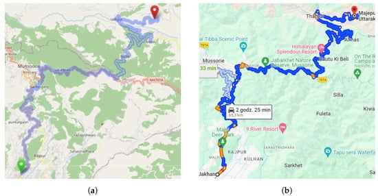 All routes with road distances around 65 km are concentrated in the Dehradun area. Dehradun is situated in a valley at the foot of the Himalayas, resulting in a limited number of roads leading to the surrounding areas. A comparison of the selected route determined by the OSRM API and Google Maps is shown in Figure 4. Both engines visually identified the same route; however, Google Maps indicates that the route is approximately 2 km longer. This discrepancy may stem from differences in point positioning on various maps and the distinct distance calculation algorithms used. While the exact route lengths also vary among engines utilizing only OSM data, these differences are negligible over shorter distances.