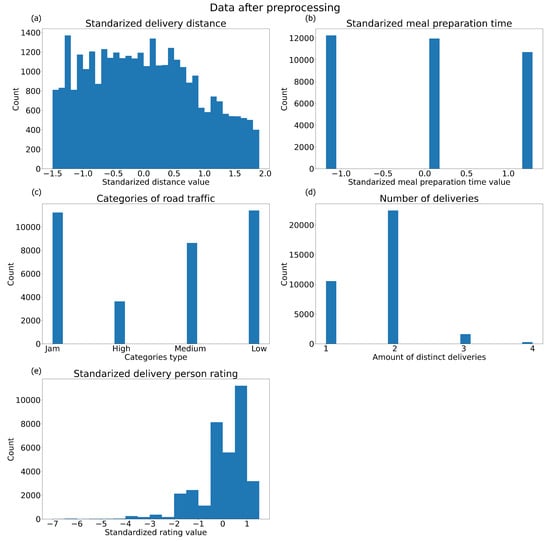 Histograms of data used in inference. (a) Standardized distance, bins defined as <−1.5;2> with steps of 0.1. (b) Standardized meal preparation time, 20 bins equally spaced, automatically defined by program. (c) Categories of road traffic, from highest to lowest. (d) Distinct deliveries count. (e) Standardized delivery person rating, bins defined as <−7;2> with steps of 0.5.