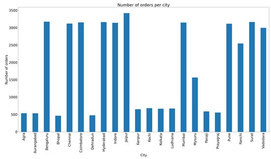 The aim of the spatial analysis was to analyze the frequency of use of road segments. Orders are not evenly distributed among all 21 cities. The analysis included all those located in India, and a route for them could be determined (including data considered as outliers). Jaipur is the clear leader in terms of the number of orders, with over 3400 deliveries located there. Eight cities have very similar values at the level of 3150 deliveries. These include the largest cities in India such as Bangalore and Mumbai. Cities in which the previously calculated outliers occurred have a significantly lower number of deliveries in their area. A chart showing the number of orders for each city is shown in Figure 7. Discrepancies in orders among different cities are expected, as previous studies conducted in China and England have shown that densely populated areas have higher OFD platform usage [15,22]. Limited representations of smaller cities may lead to inaccurate delivery time estimation in these cities. On the other hand, it may improve the generalizability of the model.