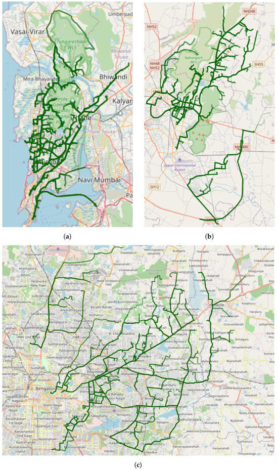 Route visualizations of routes on a city street graph made in OSMnx for (a) Mumbai, (b) Jaipur, and (c) Bangalore. Sections of roads that were heavily trafficked with deliveries have a more intense color, while sections that were traveled once or twice are much less visible.