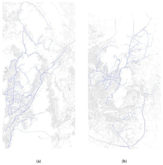 Another method we considered was visualizing routes on road network graphs. This required generating a graph representing the road network. We utilized the OSMnx library [38], which provides tools to model, analyze, and visualize street networks and other geospatial features from OSM. The generated graph, along with the routes obtained from the OSRM API, needed to be converted into a common format and then plotted as a high-resolution image. In contrast to interactive maps, differences in road segments’ intensity will be more visible. Additionally, there will be no unnecessary elements like different icon types.