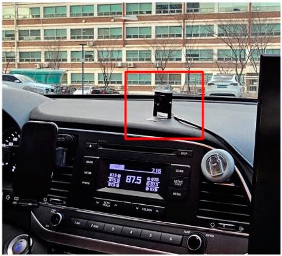 The camera used for recording was the Arducam 8PM (USB Camera). The data were saved using the OpenCV library in an Ubuntu 18.04 environment, with recordings made at 10 fps and an image resolution of 1280 × 720. Our study does not require a high fps since it does not demand the natural continuity of actions, but rather focuses on capturing images where specific actions appear. For instance, if the purpose were to measure the frequency of eye blinking, a high fps would be necessary to ensure that no moment of the eye closing and opening is missed. However, since our study aims to learn the visual characteristics of specific actions rather than the frequency of the actions, meaningful features can be extracted even with a lower fps. The camera was installed in the center of the vehicle interior, as shown in Figure 2, to capture the driver.