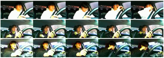 Figure 3 shows examples of the captured data at 1 s intervals. The first row in Figure 3 depicts a driver nodding off and yawning. The second row shows a driver rubbing their arms and tapping their shoulders, while the third row shows a driver yawning and rubbing their eyes.