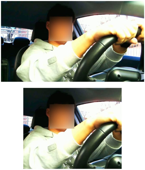 The original captured image has a size of 1280 pixels by 720 pixels. Since this study focuses on learning the driver’s behavior patterns, the background area, which excludes the driver, contains unnecessary information. Therefore, the background area is partially removed using OpenCV [30]. The image with the background removed is shown in Figure 4.