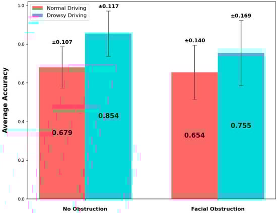 Figure 6 depicts the average accuracy (indicated on the bars) and standard deviations (indicated at the ends of the bars). We see that without facial obstruction, the average accuracy is 0.679 for normal driving and 0.854 for drowsy driving. The high accuracy score for drowsy driving validates that the model can accurately detect dangerous situations when drowsy driving occurs and prevent traffic accidents in advance. The average accuracy for normal driving is somewhat lower than for drowsy driving; however, this can be interpreted as the algorithm making conservative predictions on drowsy driving.