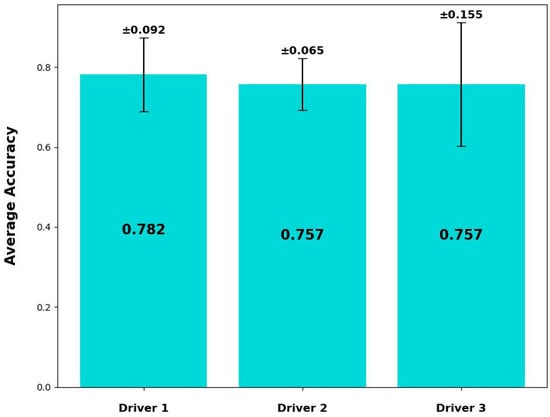 In Figure 7, we present the average accuracy (indicated on the bars) and standard deviations (indicated at the ends of the bars) for three drivers that were not in the training dataset without facial obstructions. The average accuracies range around 0.75 to 0.78, with standard deviations ranging from 0.065 to 0.155. This confirms that the model maintains consistent performance regardless of the driver. Recent AI-based studies like [13,14,15] could not secure a sufficient amount of data per driver due to the issue of data scarcity, which prevented them from performing driver-specific accuracy evaluations. As a result, the reliability of these methods in maintaining consistent performance when the driver changes cannot be assured. However, our study demonstrated that our approach and training methodology can consistently achieve stable model performance by measuring the accuracy for each individual driver.