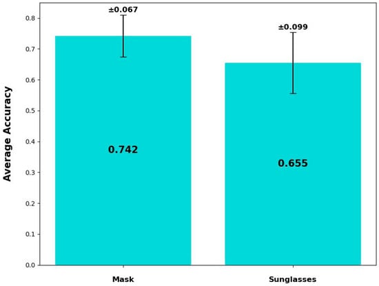Accuracy with facial obstruction, divided into groups with masks and sunglasses.