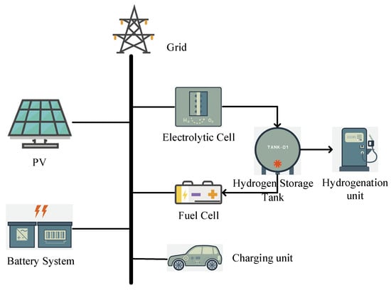 The hydrogen–electric coupling microgrid studied in this paper consists of photovoltaic generation units, battery systems, electrolytic cells, hydrogen storage tanks, and fuel cells, as well as charging and hydrogenation units. The system architecture is illustrated in Figure 1.