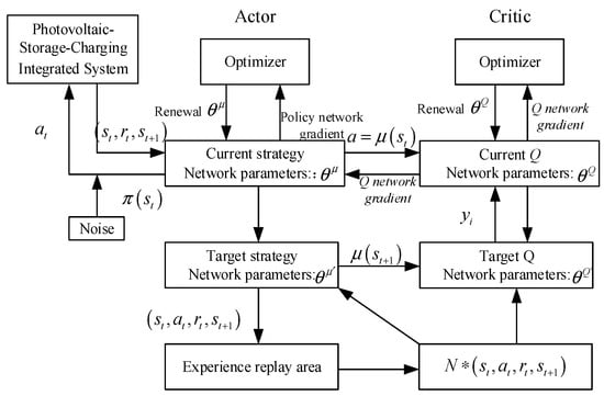 The deep deterministic policy gradient (DDPG) algorithm, based on the actor-critic framework, draws from DQN’s experience replay mechanism and target network concepts, specifically addressing continuous action spaces. The DDPG network comprises both actor and critic networks, including current and target networks. The experience replay mechanism reduces sample correlation by randomly selecting samples from the experience pool during training. The target network maintains fixed parameters over time to eliminate model oscillation caused by identical parameters between the current and target networks. Consequently, the DDPG possesses robust deep neural network fitting and generalization capabilities and excels in continuous action spaces. Furthermore, it can learn the optimal action policy for the current state through ongoing training and adjustment of neural network parameters. Applying this method to energy management in hydrogen–electric coupled microgrids allows for more continuous action outputs and reduced decision-making errors. The structure is as follows The structure is shown in Figure 2.