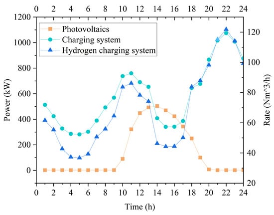 In the equation, denotes the photovoltaic power generation of the hydrogen–electric coupled microgrid during time period ; represents the electrolyzer’s hydrogen production power during time period ; refers to the energy storage system’s charge and discharge power during time period , with discharging being positive and charging being negative; and signifies the station’s electrical load power during time period .