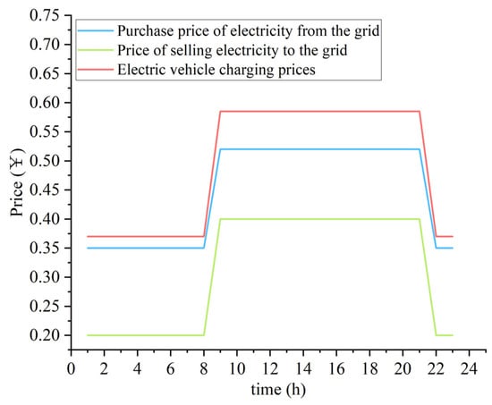 Taking a regional hydrogen–electric coupled microgrid as an example with the parameters shown in Table 1, the system comprises a 600 kW photovoltaic array, an electrical energy storage system with a rated capacity of 360 kW·h, a state of charge ranging from 0.2 to 0.8, a rated power of 100 kW, an electrolyzer with a rated power of 750 kW, where the hydrogen–electric conversion efficiency is estimated at 20%, meaning 5 kWh of electricity can produce 1 Nm3/h of hydrogen, a hydrogen storage tank with a capacity of 1000 Nm3, thirty DC charging stations with a rated power of 30 kW each, providing a total charging capacity of 900 kW, five hydrogen refueling stations with a refueling rate of 30 Nm3/h each, aggregating a total refueling rate of 150 Nm3/h, a hydrogen refueling service price of CNY 5.8/Nm3, and a carbon trading price of CNY 0.07/kg, and the photovoltaic generation and charging/hydrogen load forecast curves for a typical day are illustrated in Figure 3, while the time-of-use electricity pricing is shown in Figure 4.