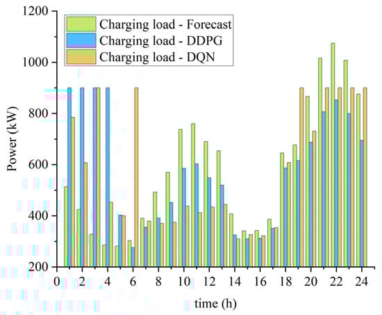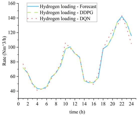 Comparing the charging strategies under the DDPG and DQN algorithms as shown in Figure 8, both algorithms achieve the optimization of shifting charging loads to periods of lower electricity prices; however, the charging load curve under the DDPG algorithm is notably smoother. Additionally, Figure 8 reveals that the total hydrogen charging demand is 1950.83 Nm3, with the DDPG algorithm showing an error of 0.01% and the DQN algorithm an error of 4.03%. This indicates that the precision of the DDPG algorithm significantly surpasses that of the DQN algorithm, a benefit stemming from the DDPG’s ability to adjust hydrogen charging quantities within a continuous range (e.g., from 42.89 to 142.15), allowing for finer-grained adjustments, which will be reflected in the operational costs of the microgrid.