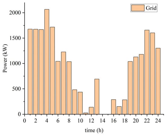 Combining the photovoltaic power generation curve shown in Figure 3 with the operational strategy diagram of the hydrogen storage tanks and electric energy storage systems depicted in Figure 6, we analyze the exchange power between the hydrogen–electric coupled microgrid system and the public grid, as illustrated in Figure 9. During the periods from 00:00 to 08:00 and from 21:00 to 24:00, the power purchased from the grid is relatively high, primarily due to substantial electrolyzer operation and electric vehicle charging demands. Conversely, between 11:00 and 16:00, photovoltaic power generation peaks, significantly reducing the need for grid power purchases, and there is even no need to purchase power from the grid between 14:00 and 16:00.