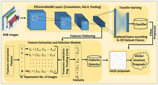 Initially, preprocessing is applied uniformly across the dataset to normalize and make them compatible with the pre-trained deep learning model, i.e., EfficientNet. Each image I is split into four equal patches to preserve the objects’ location, then resized and normalized to meet the EfficientNet’s input requirements. The pre-trained model then extracts features from each pre-processed image tiles using the feature extraction function to map the input image to a high-dimensional feature vector as