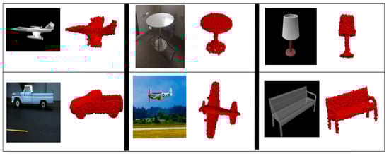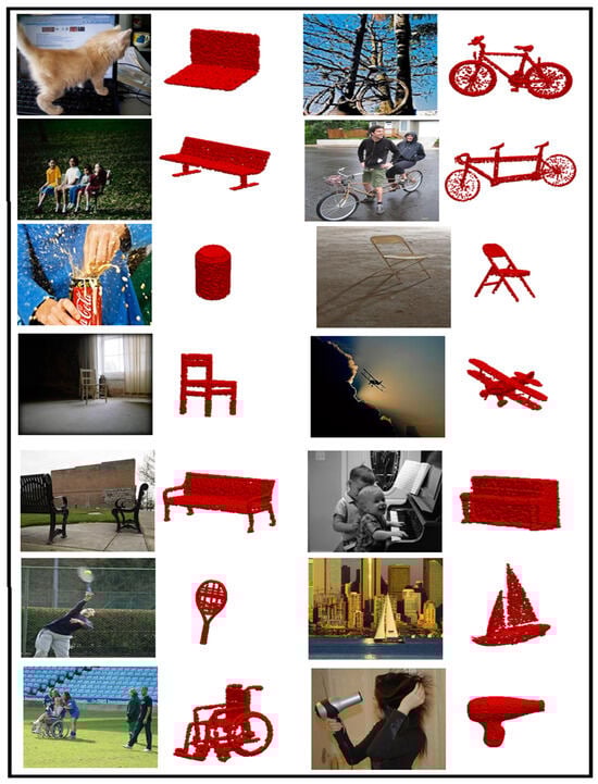 To assess the effectiveness of the method, experiments were conducted on the ObjectNet3D [], ShapeNet [], and Pix3D datasets []. All these datasets exhibit distinct data distributions. The ObjectNet3D dataset, as described in [], comprises 90,127 images of objects in real-world scenes, with 44,500 3D CAD models organized into 100 categories. This dataset proves valuable for tasks involving understanding object shapes and orientations in diverse environments. It offers a diverse set of object categories and a wide range of scenes, thereby enhancing the robustness and generalization capabilities of computer vision models. We utilized this dataset to validate the proposed architecture on complex and occluded images.