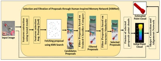 The Human-Inspired Memory Network (HIMNet) addresses the information gap between 2D images and 3D representations by searching for proposals with similar structures within the same category. It generates an initial estimate of point clouds to maintain critical spatial information within the 3DRecNet architecture, thereby enhancing the network’s capability to predict 3D shapes from occluded objects and complex backgrounds. The concept is analogous to how humans draw on past experiences and memories to visualize an object’s shape. HIMNet represents an evolution of the proposal retrieval network, specifically designed to filter outliers by focusing on proposals with similar structures within the same category. The steps involved in this module are discussed below, and presented in Figure 4.