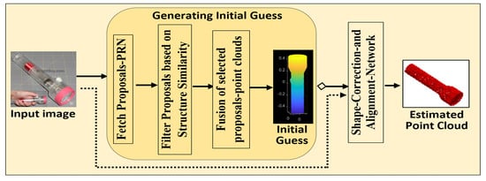Optimized sequence for faster point cloud estimation from input images. Includes an optional initial guess and subsequent refinement via shape correction and alignment network for final 3D point cloud estimation.