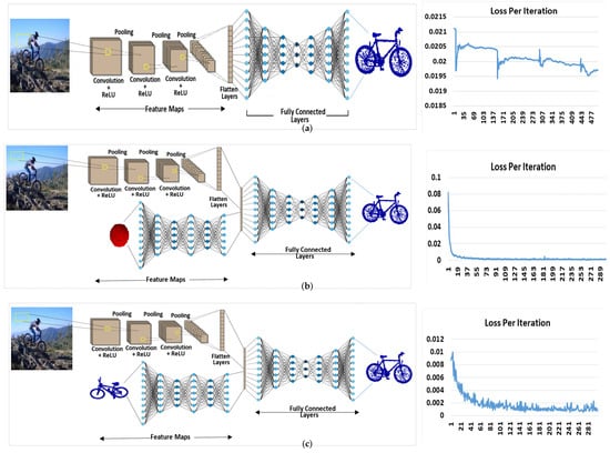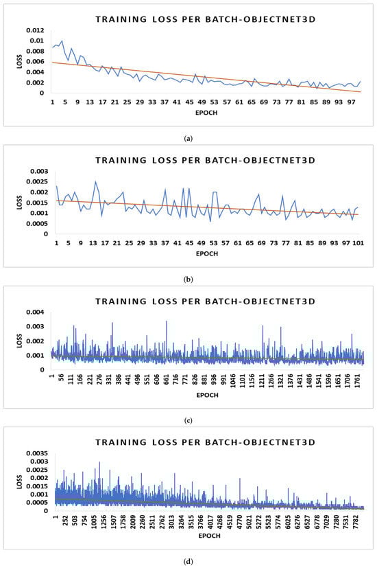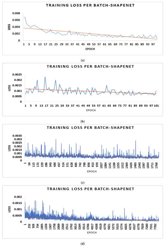 During training, we utilized the L2 normalization for both image and point cloud features. The final merging branch (decoder) consists of a series of linear layers that create the 3D point cloud shape, converting fused features into the 3D model. The entire model is trained using backpropagation and optimized with default parameters using stochastic gradient descent (SGD). Including the initial point features helps the model learn the complexities in the geometry of objects’ shapes. Without this integration, the model struggles to understand occluded objects and complex shapes, as confirmed through multiple images in Figure 9 of the dataset and the training loss functions in Figure 10. These figures show that when initial point cloud features (as memory of the network) are included, the model can handle complex object geometries and shapes.