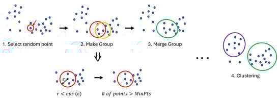 Figure 1 illustrates stages of the DBSCAN clustering algorithm. First, a random point is selected, and the distances to nearby points are measured. Based on computed distances, it is determined whether a certain number of points () exist within a specific radius () from the core point. If the number of points within the radius exceeds , the core point and the points within this distance form one group. Once a group is formed, another point within the group is selected and the process repeats, measuring distances to nearby points and deciding whether to form a new group. If a new group is formed, it merges with the existing group to which the core point belongs. If not, another point within the group is chosen to search for possible group formation. This process of checking each point in the group continues until all possible group formations have been searched, concluding the merging for that group. Once one group is fully formed, the process starts again with a random point that has not been included in any group. This continues until all points have been checked for group formation, at which point the clustering process is completed.