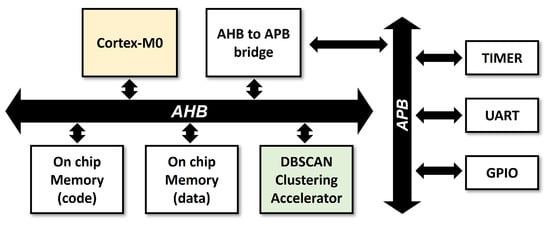 Figure 2 illustrates the block diagram of the system. The proposed design is organized around the advanced high-performance bus (AHB) and the advanced peripheral bus (APB). Modules requiring high-speed bus interfaces for data transfer, such as the Cortex-M0, on-chip memory for code and data, and the DBSCAN clustering accelerator, are connected to the AHB. Peripheral modules that do not necessitate high-speed data communication, such as GPIO, universal asynchronous receiver transmitters (UART), and a timer, utilize the APB interface. The AHB to APB bridge facilitates communication between the two buses by changing bus the signal.
