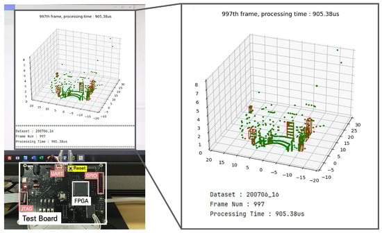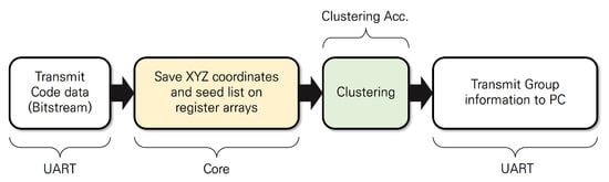 Our previous research [] also verified the operation of a DBSCAN accelerator designed with Verilog and implemented on an FPGA, which successfully accelerated the clustering and demonstrated the feasibility of a DBSCAN clustering accelerator for LiDAR’s point clouds.